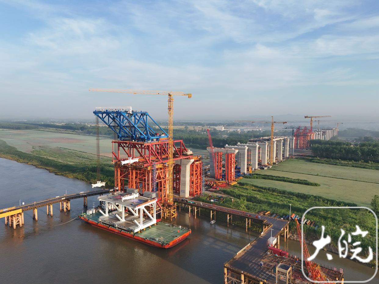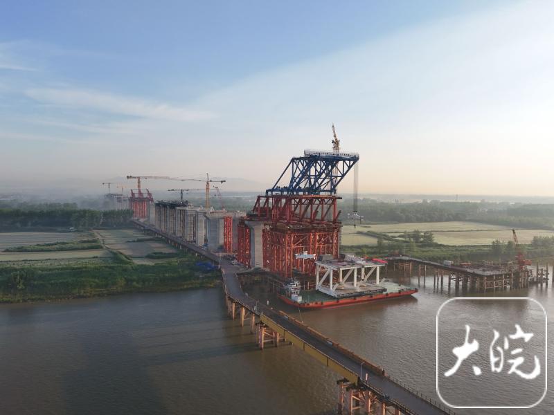 5月14日,位于枞阳县的池州长江公铁大桥2号主墩施工现场,全桥首节钢桁梁成功吊装到位。